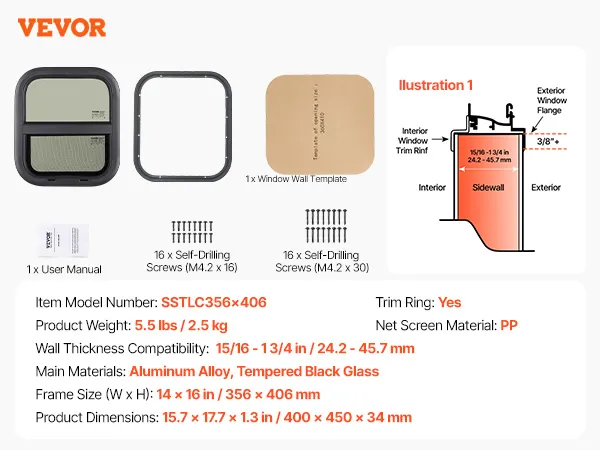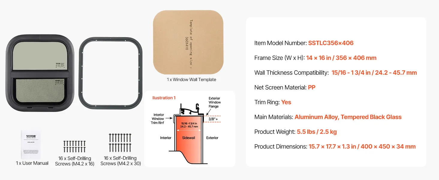 The VEVOR teardrop window RV is suitable for most recreational vehicles, trailers, campers, and cargo trailers. It measures 14 inches wide by 16 inches high, making it easy to replace old or damaged windows. It is compatible with wall thicknesses ranging from 15/16 to 1 3/4 inches and is widely applicable across models.