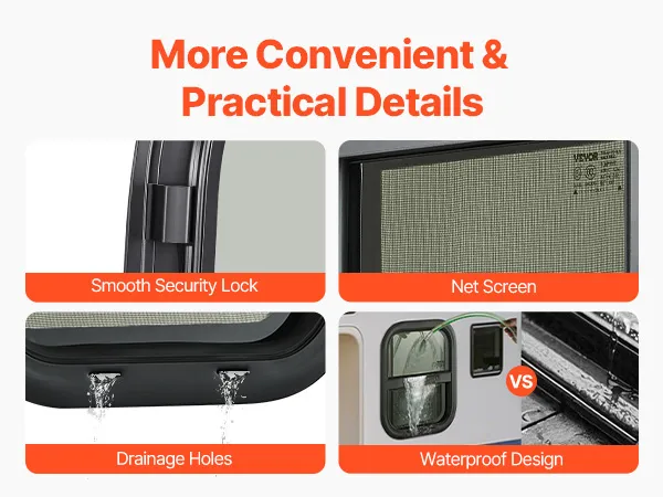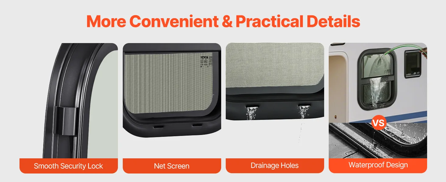 Drying the edges also helps preserve the seals and frame without damage or mold. It also simplifies maintenance, so you do not have to worry about frequent water stains and leaks. With this design, your VEVOR window RV will last longer and remain in excellent condition for many years.