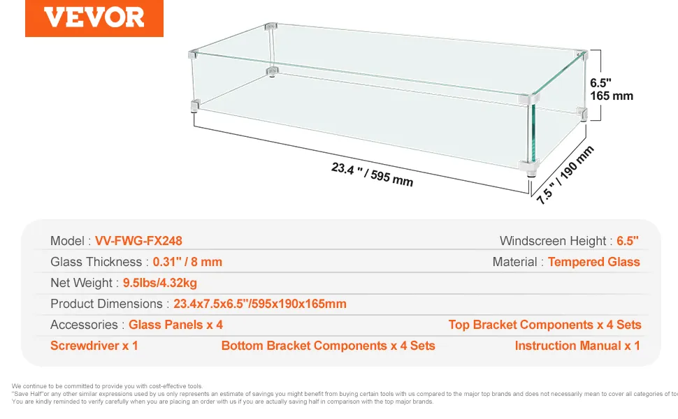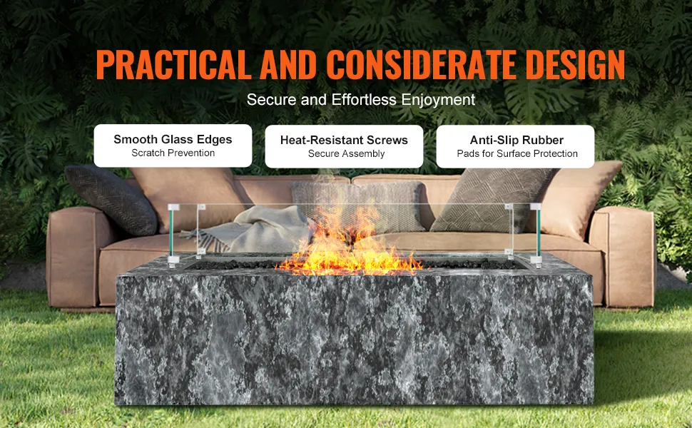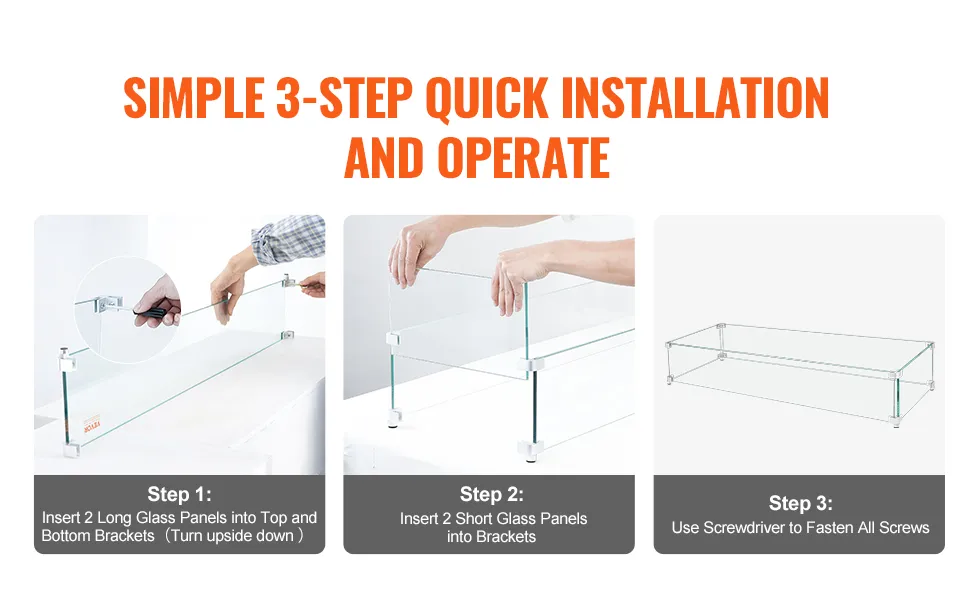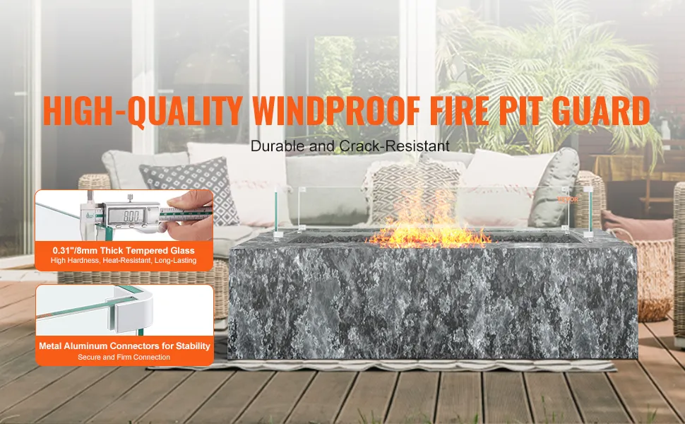 The VEVOR square fire table wind guard is easy to set up. Assembly is quick and easy, even if you don't have any tools. The guard comes with all the necessary hardware. You will find the process hassle-free. We have crafted this guard from robust tempered glass. It ensures it can withstand high temperatures and harsh weather. The glass is thick too. Once assembled, the guard remains stable and secure. This guard is a reliable addition to your fire pit setup. The robust design makes it a dependable investment. Enjoy the peace of mind that comes with a reliable and safe fire pit.
