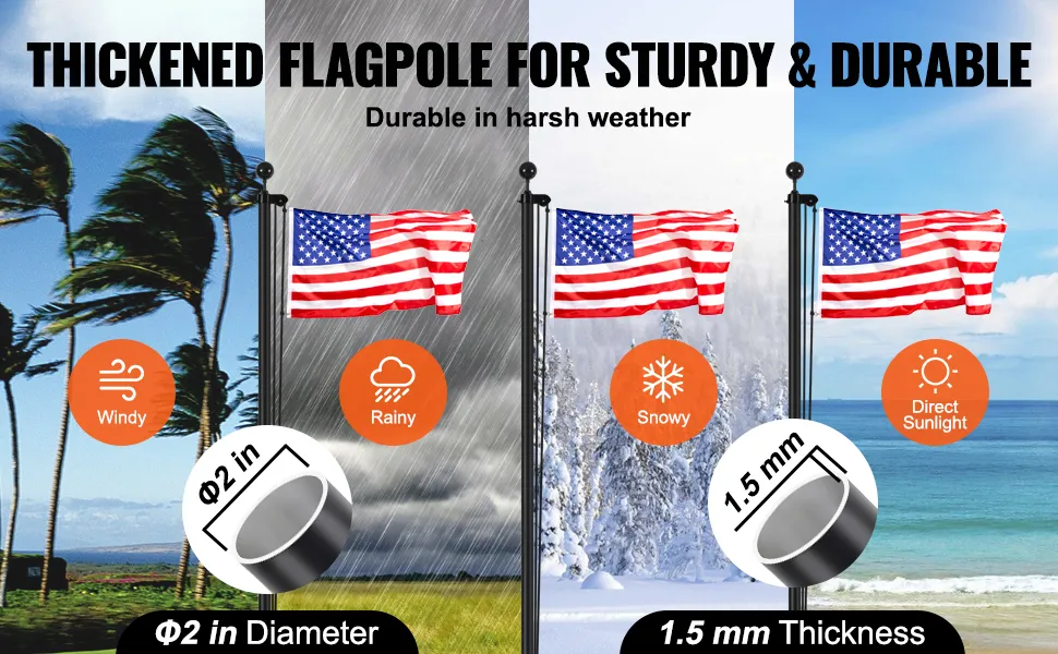 This flagpole is made from heavy-duty aluminum. It is designed to withstand harsh weather conditions. The aluminum alloy is treated for wind and rust resistance. You can handle strong winds and storms. Even in ice and snow, the flag pole remains stable and reliable. Thus, it is less likely to deform or get damaged. This makes it a reliable choice for outdoor use. Our flagpole has withstood the test of time and nature. The sturdy construction ensures it stands firm in areas that face high winds or storms. It is built to last.