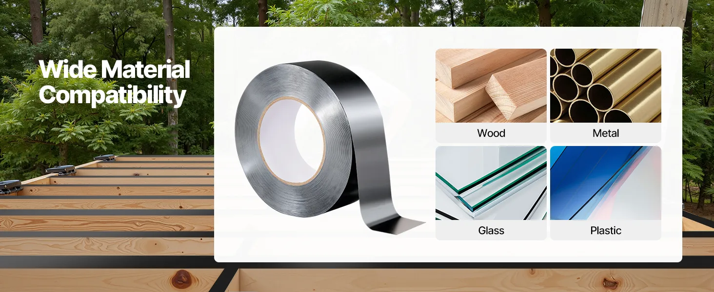 Our deck flashing tape adheres firmly to various materials such as wood, metal, plastic, and glass. It is suitable for roof waterproofing, deck sealing, pipe wrapping, and car leak repair, achieving versatile use in one roll.
