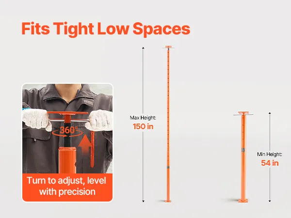 Adjustable Height Design: Need flexibility? This house floor jack features an adjustable height design. It adjusts from 54 to 150 in/1372 to 3810 mm, so you can find the ideal height for your needs
