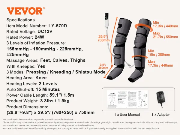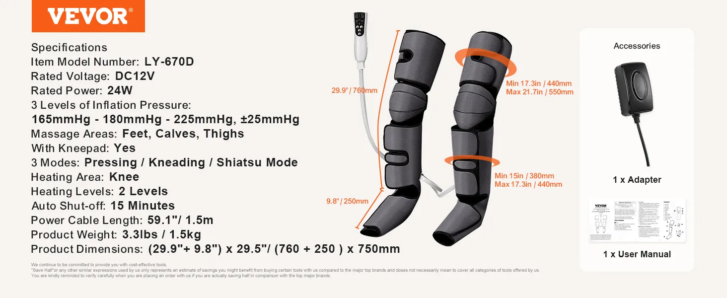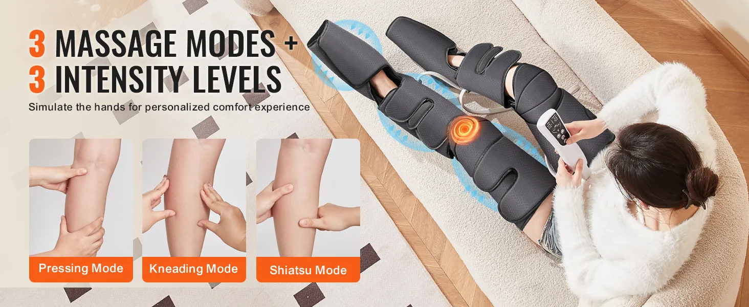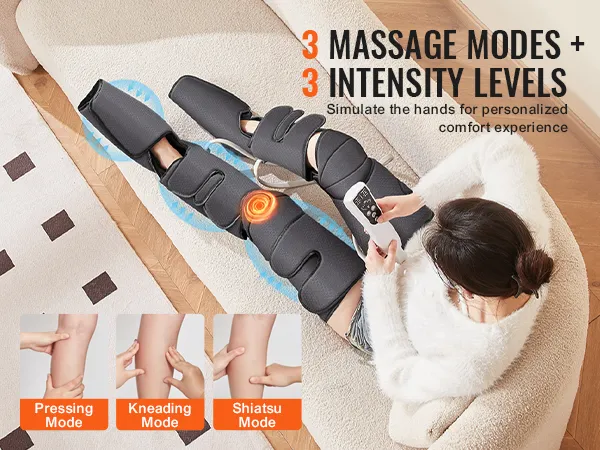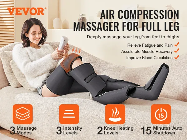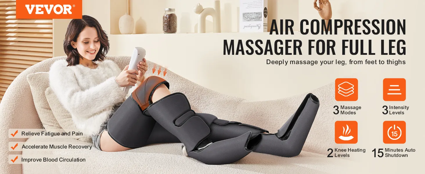 The VEVOR full-leg massager offers comprehensive relief for fatigue and pain. It targets your feet, calves, knees, and thighs. This air compression leg massager helps to improve blood circulation and reduce swelling. It can help people who sit a lot, wear high heels, or are physically active. Also, it is suitable for varicose veins and spasms (also known as edema). The massage's air compression technology provides incredibly deep-effective massage. With this product, anyone looking to calm down tired and aching legs will experience better overall comfort.