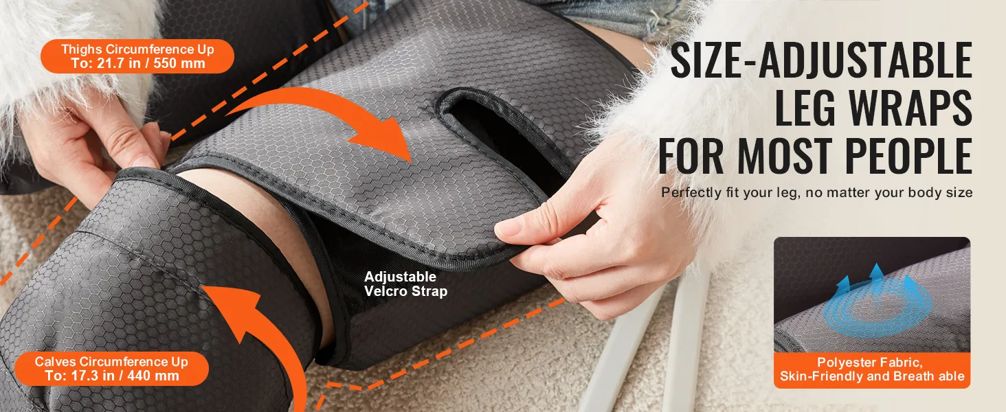 This full-leg massager is adjustable in size. It fits most people. You can adjust the calf circumference from 15.0" to 17.3", and the thigh circumference from 17.4" to 21.7". This ensures a comfortable fit for different body types. Velcro straps facilitate easy size adjustment, particularly when you leave an insertion space of 3-4 fingers to avoid excessive tightness. This way, you get the best massage experience without discomfort.