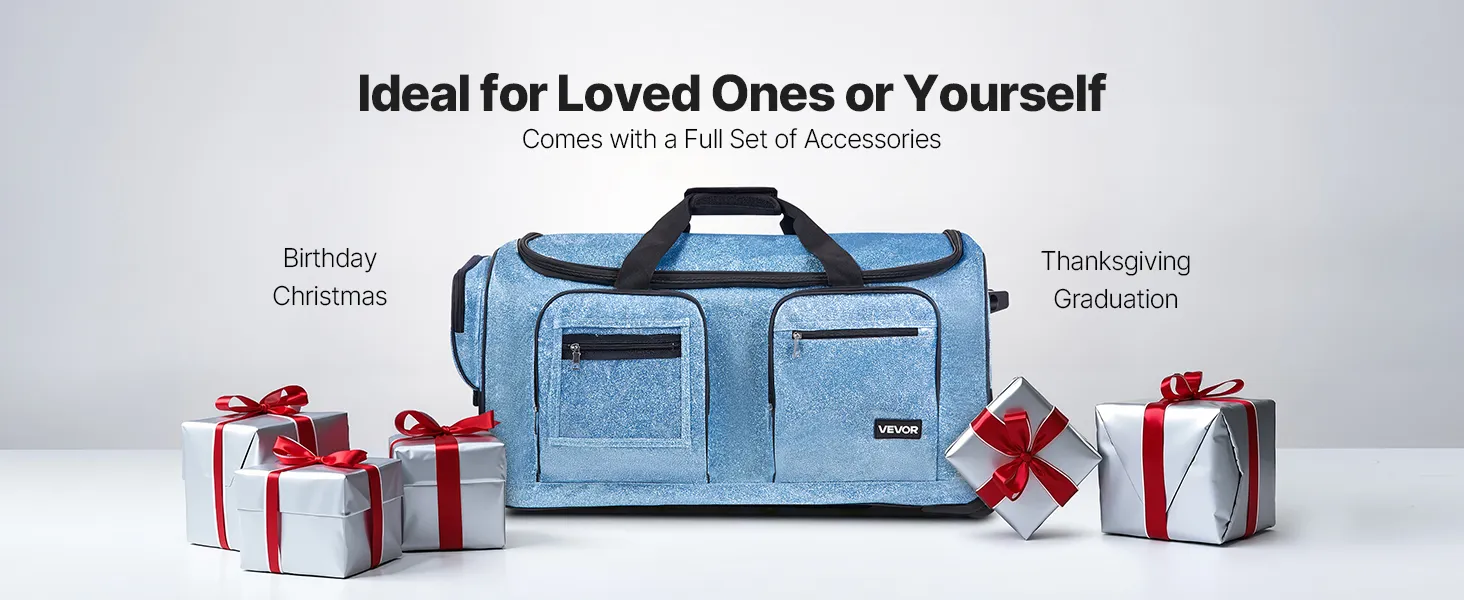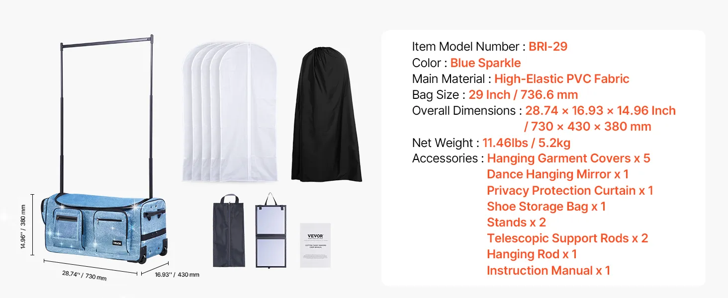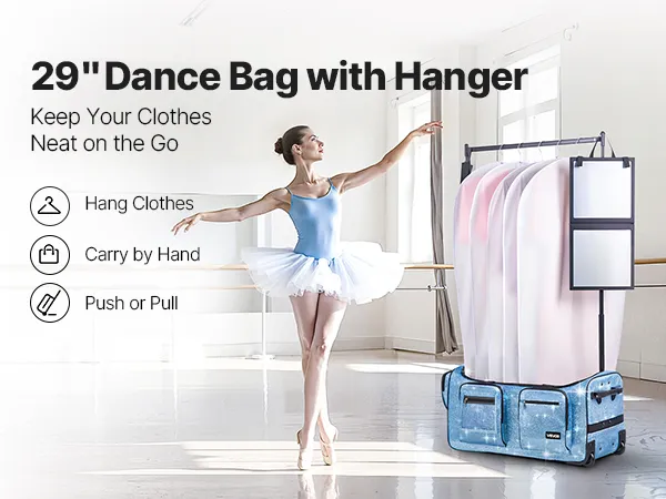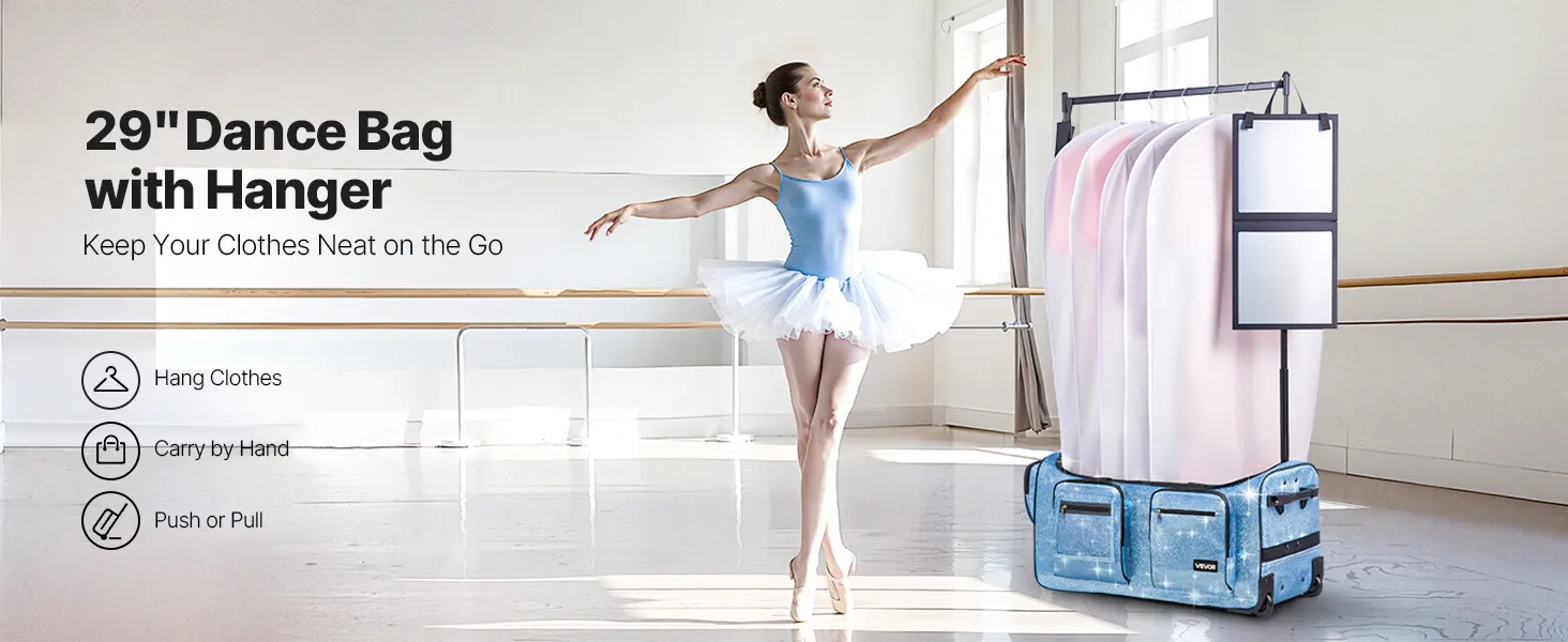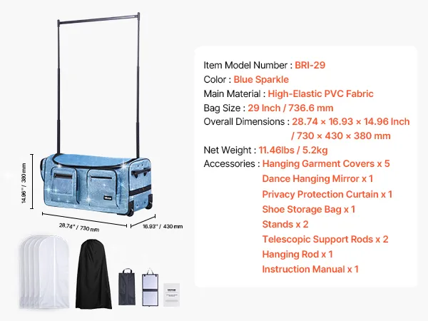 VEVOR Dance Bag with Garment Rack, 29 Inch Rolling Dance Duffel, with Wheels, USB Port, Height Adjustable Clothes Rack, Privacy Protection Curtain, Ideal for Travel and Competitions, Sparkling Blue