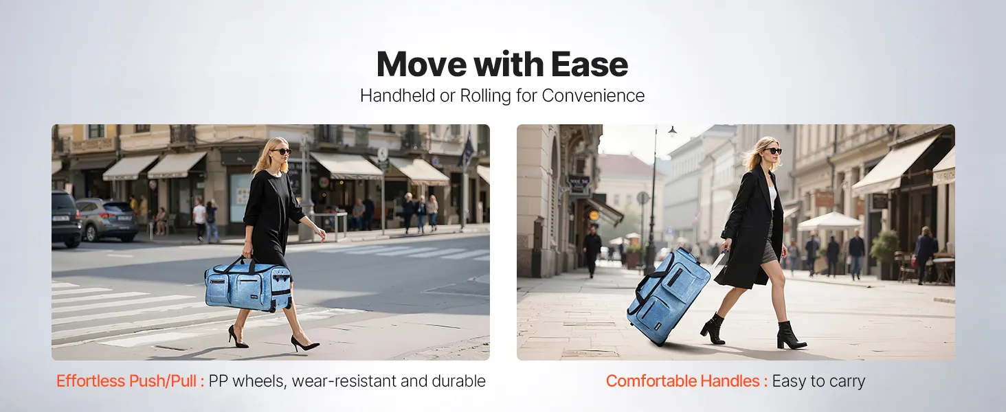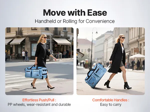 This 23-inch duffle bag with garment rack supports hanging clothes and offers both hand-carry and roll options for easy storage and travel convenience.