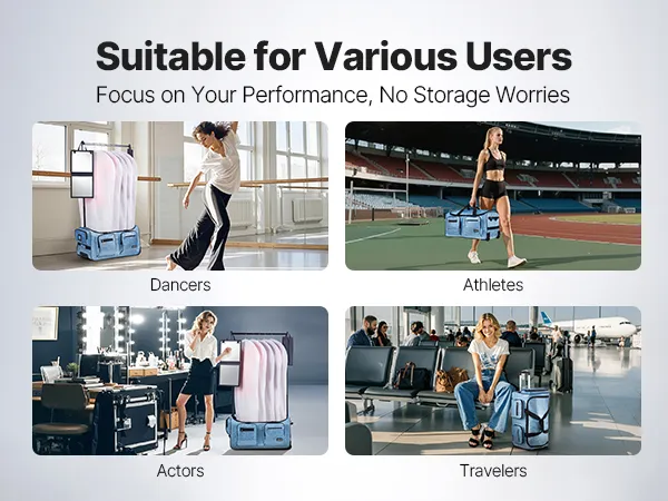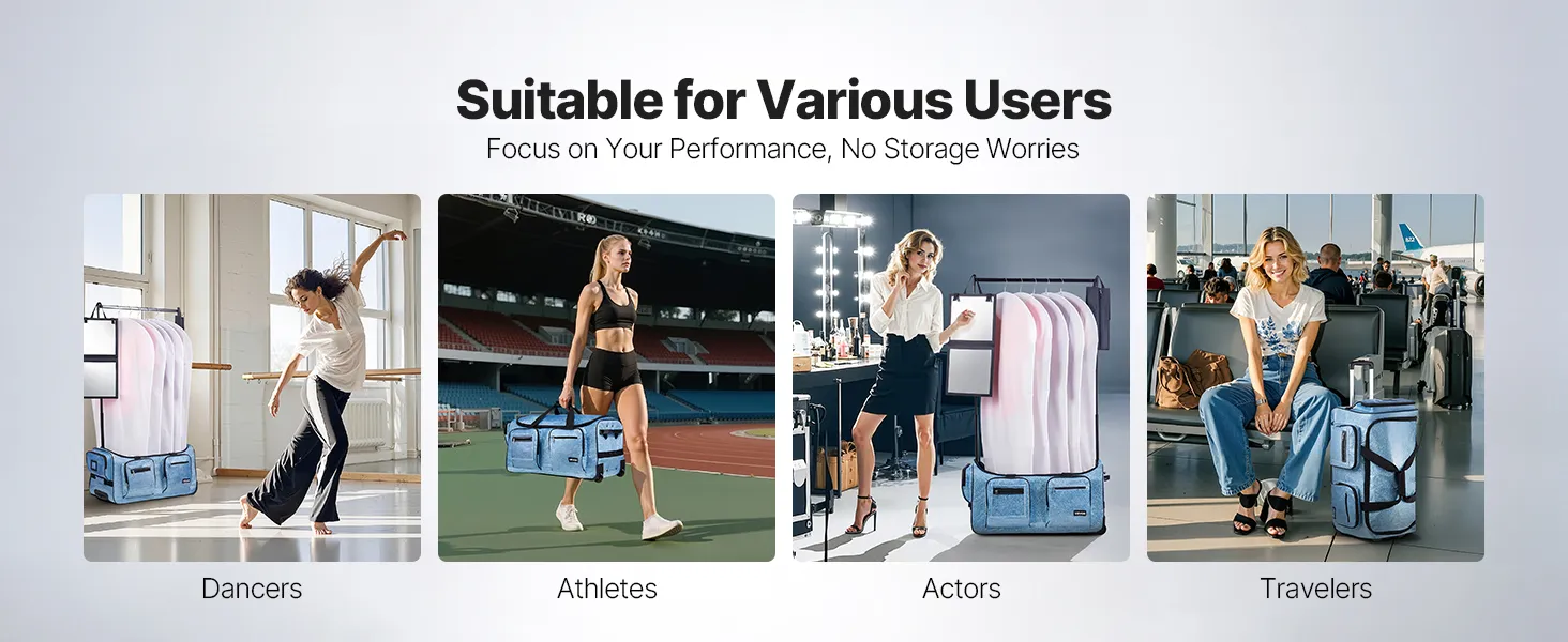 This innovative garment bag easily transforms into a portable mini wardrobe! It features a retractable stand, 10+ pockets, a dance mirror, privacy shield, and shoe bag. With a USB port and premium wheels, it's made with durable, waterproof PU100 coating for long-lasting reliability.