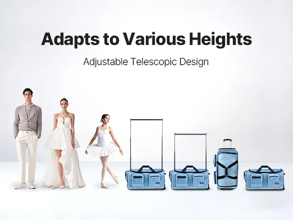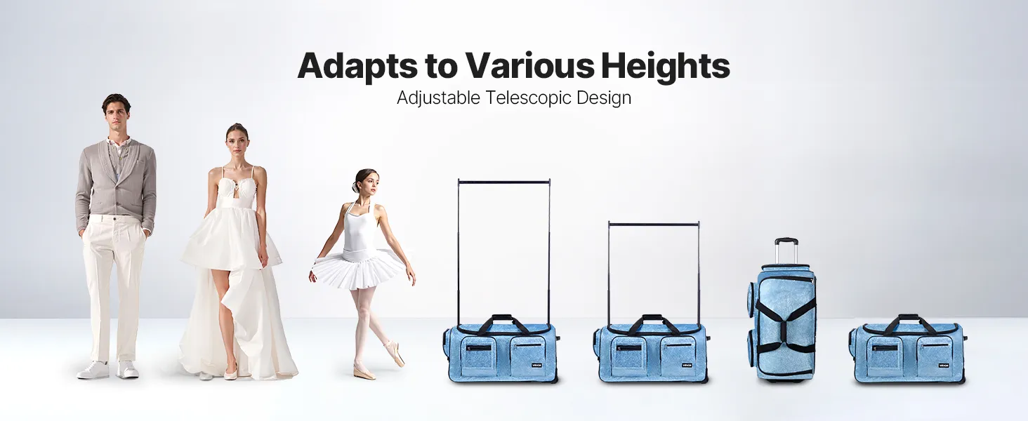 Anti-Tilt Garment Rack: This dance bag with garment rack features an adjustable height (35.43 inch / 90 cm and 57.09 inch / 145 cm), suitable for various heights, and it can be hand-carried or rolled to facilitate your dance competition