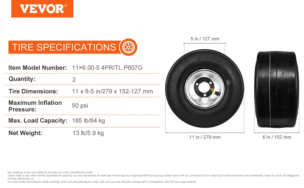 The VEVOR 11 x 6-5 go-kart wheels are designed with a high load capacity of up to 185 lbs. per wheel. This feature provides you with a safe experience while driving. The aluminum alloy rims are made of strong and durable materials, so they can handle the weight. No matter if you're racing or enjoying off-roading, these tires provide the stability you need. High load capacity means you can push your go-kart to its limits without worrying about safety. The tires offer reliable performance, guaranteeing smoother rides every time on an uneven surface.