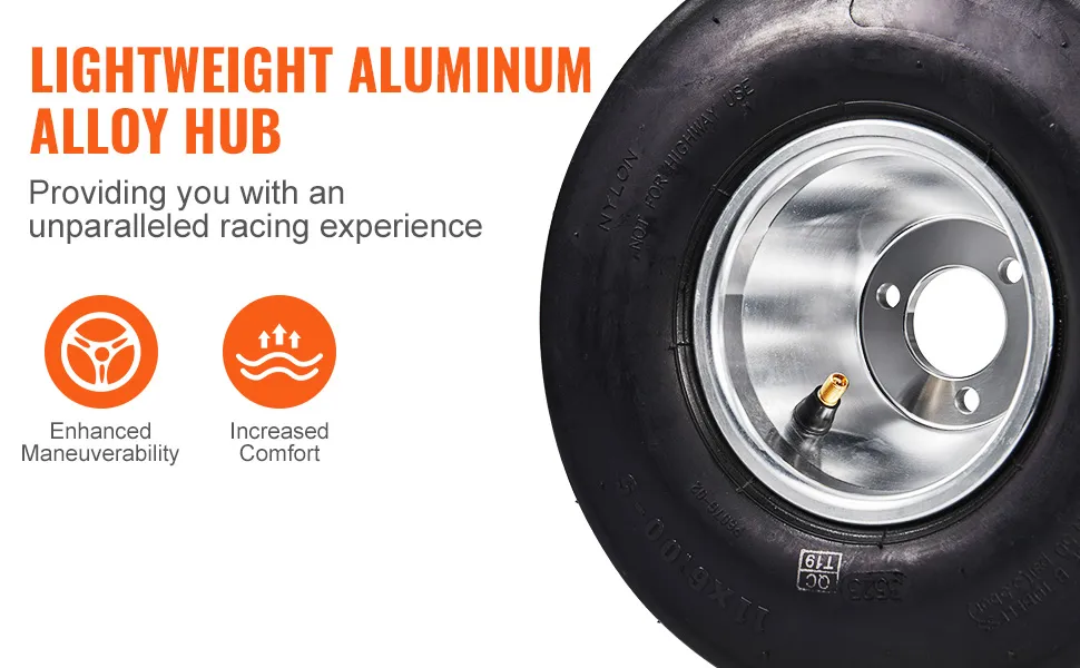 These go-kart tires have an aluminum alloy rim that enhances the overall performance of your go-karting experience. They are lightweight yet strong, providing stability and speed. The alloy construction ensures these rims can handle high speeds and rough terrain without bending or breaking. These rims are designed to last, offering long-lasting performance and durability. The VEVOR aluminum alloy go-kart rims with aluminum alloy rims are a great choice for anyone looking to improve their go-kart's performance.