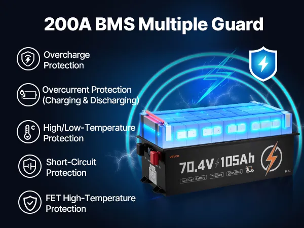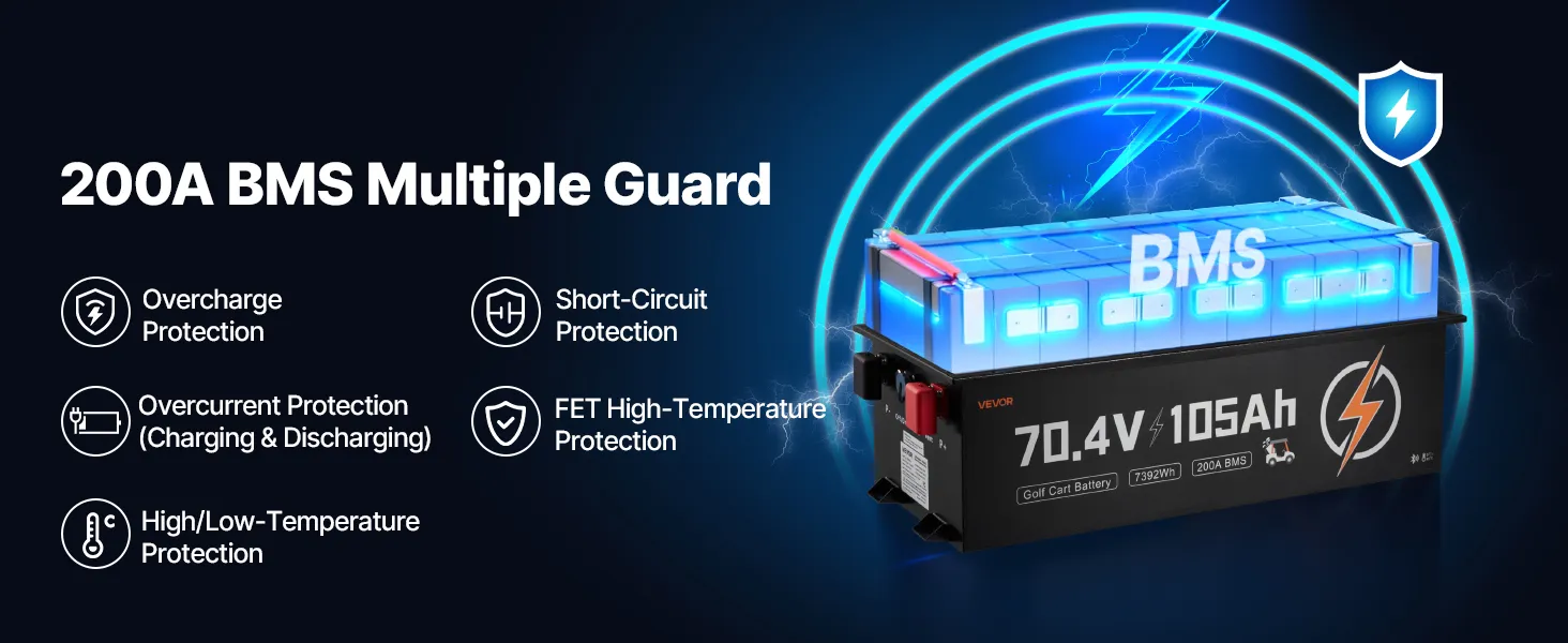 Effortless Hill Climbing: The 70.4V LiFePO4 golf cart battery delivers a 2C discharge rate, providing 200A continuous discharge and 300A peak current(30s). Climb hills effortlessly, take your golf game to the next level with reliable performance