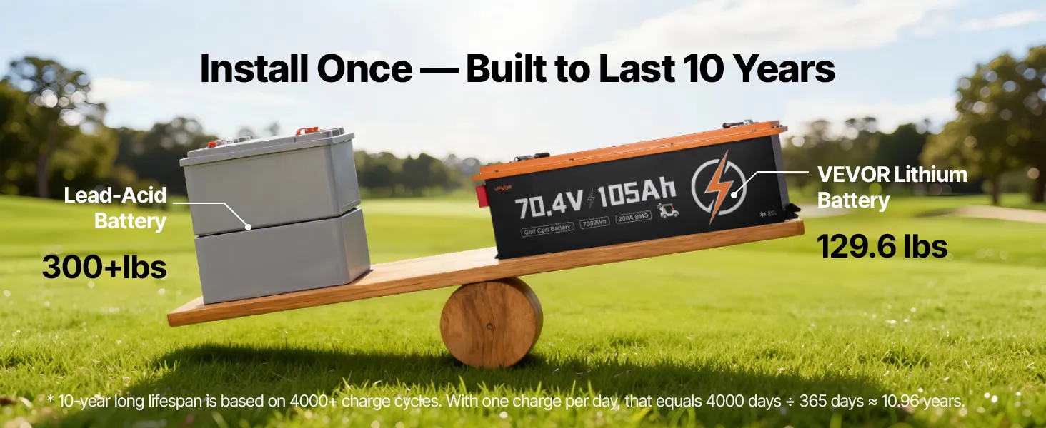 Hassle-Free Upgrade: With an integrated design, this lithium battery with charger is easier to install on compact golf carts compared to bulky lead-acid battery. With 4000+ charge cycles, it delivers up to 10 years of dependable performance with daily use