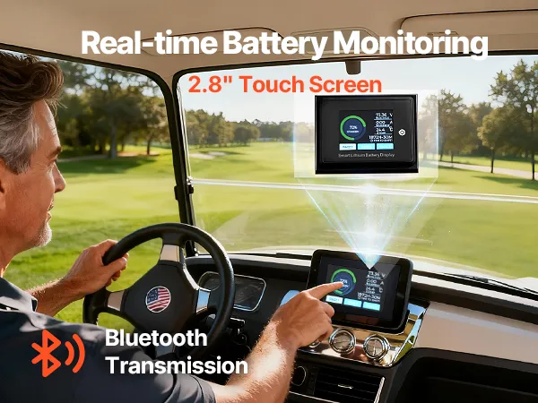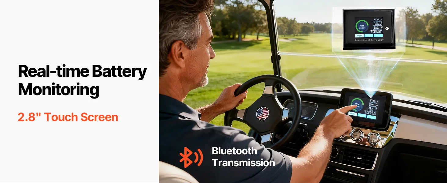 Real-Time Monitoring: Connect your LiFePO4 golf cart battery via Bluetooth to the 2.8-inch display and instantly view real-time battery charging and discharging status. Monitor your battery health just like checking your phone’s battery level