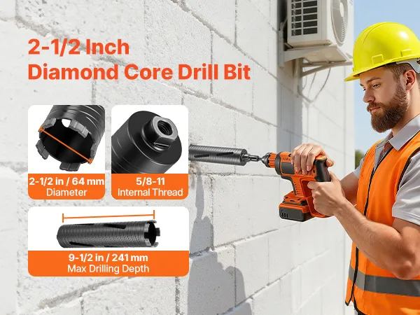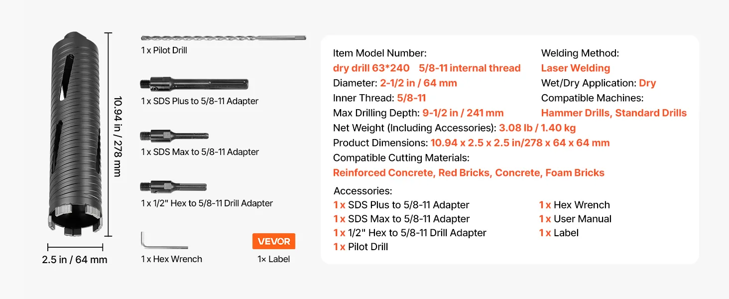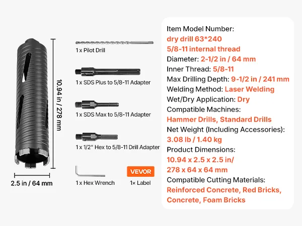 VEVOR Core Drill Bit, 2-1/2 inch Diameter, 9-1/2 inch Drilling Depth, 5/8-11 Internal Thread, Diamond Dry Coring Bit with 3 Adapters, Pilot Drill and Hex Wrench, for Concrete, Red Bricks, and Masonry