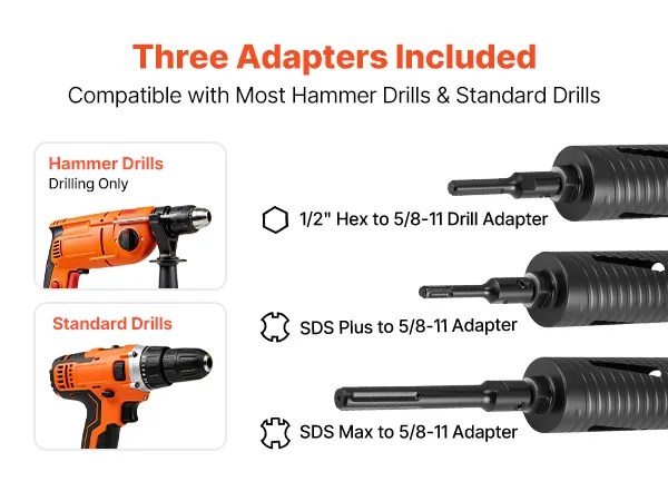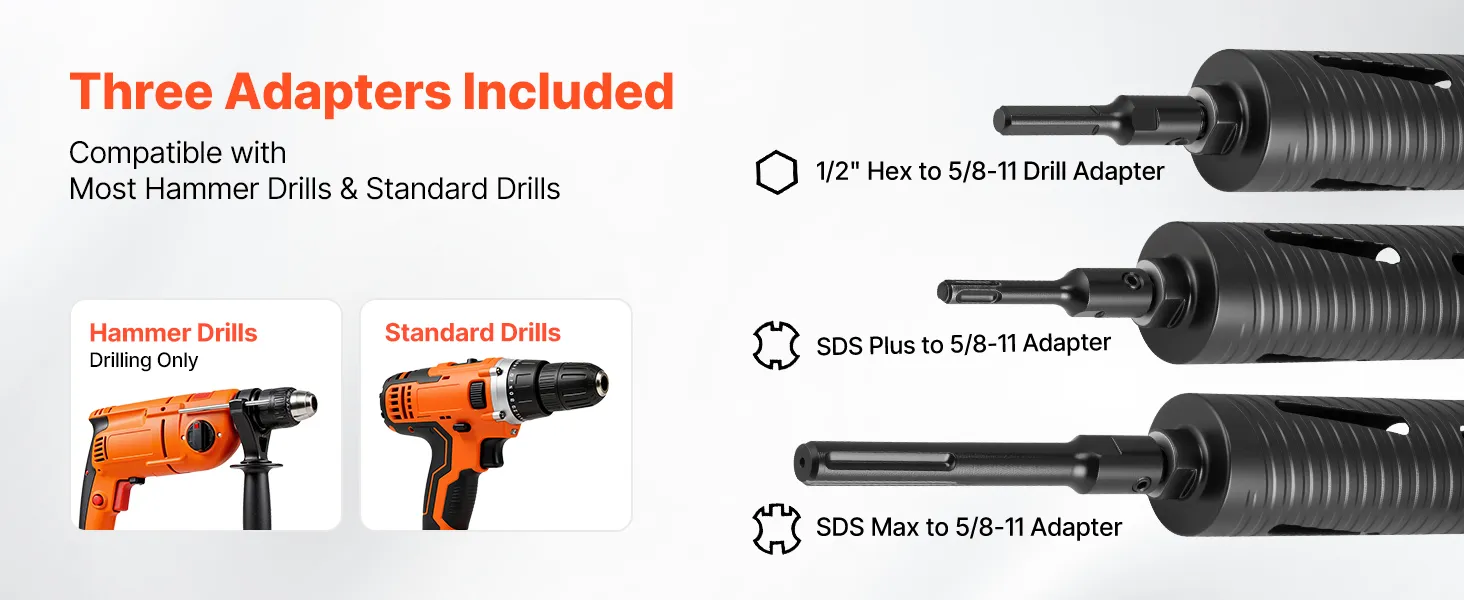 Our diamond dry coring bit includes three adapters for easy compatibility with SDS Plus, SDS Max, and 1/2 in hex drill bits. No need for additional purchases—this set handles all your drilling needs.