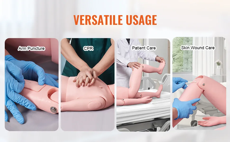 The VEVOR nursing training manikin comes with a practice kit. This kit is specifically designed for venipuncture techniques. It helps trainees master these techniques easily. The kit includes everything needed for realistic practice. So, this makes the model an essential addition to any nursing professional. The kit enhances the realism of the training sessions. In other words, it ensures trainees can practice venipuncture confidently. Our comprehensive kit supports the development of vital nursing skills in an anatomical mannequin body care simulator.