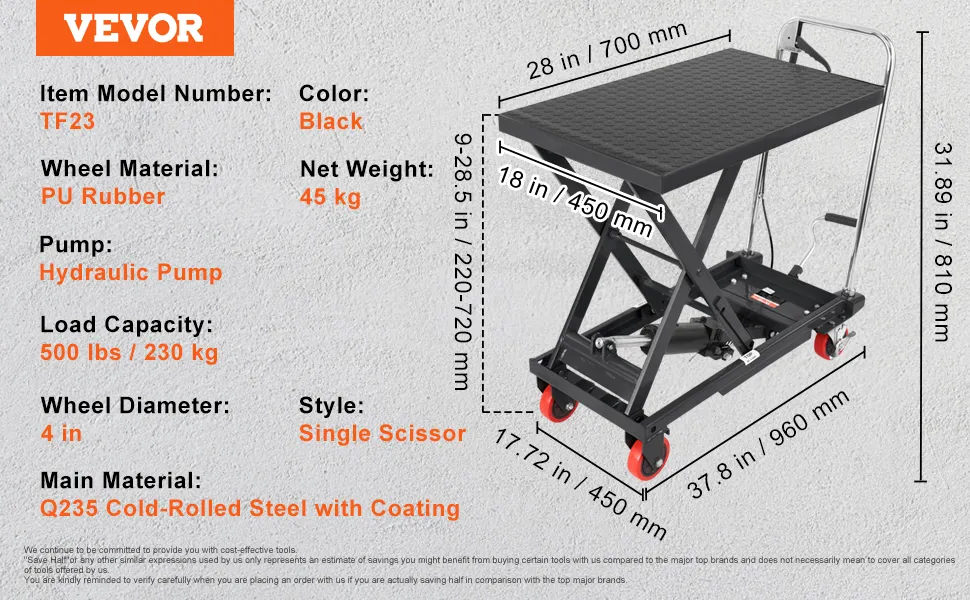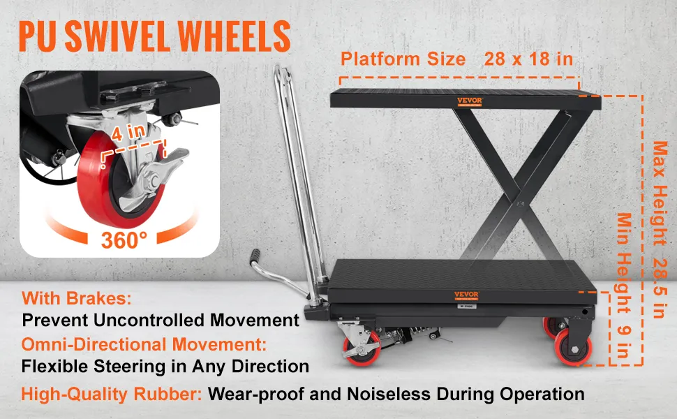 Premium Hydraulic Pump: Experience impressive heights up to 28.5 inches with VEVOR hydraulic lift table cart. Our high-quality integrated hydraulic pump ensures efficient and reliable lifting without any oil leakage issues. Get the power you need for smooth and controlled lifting performance.
