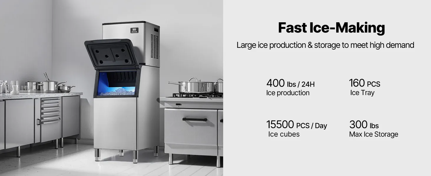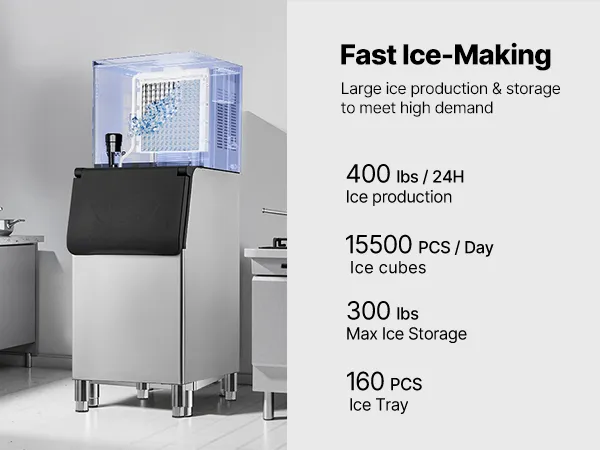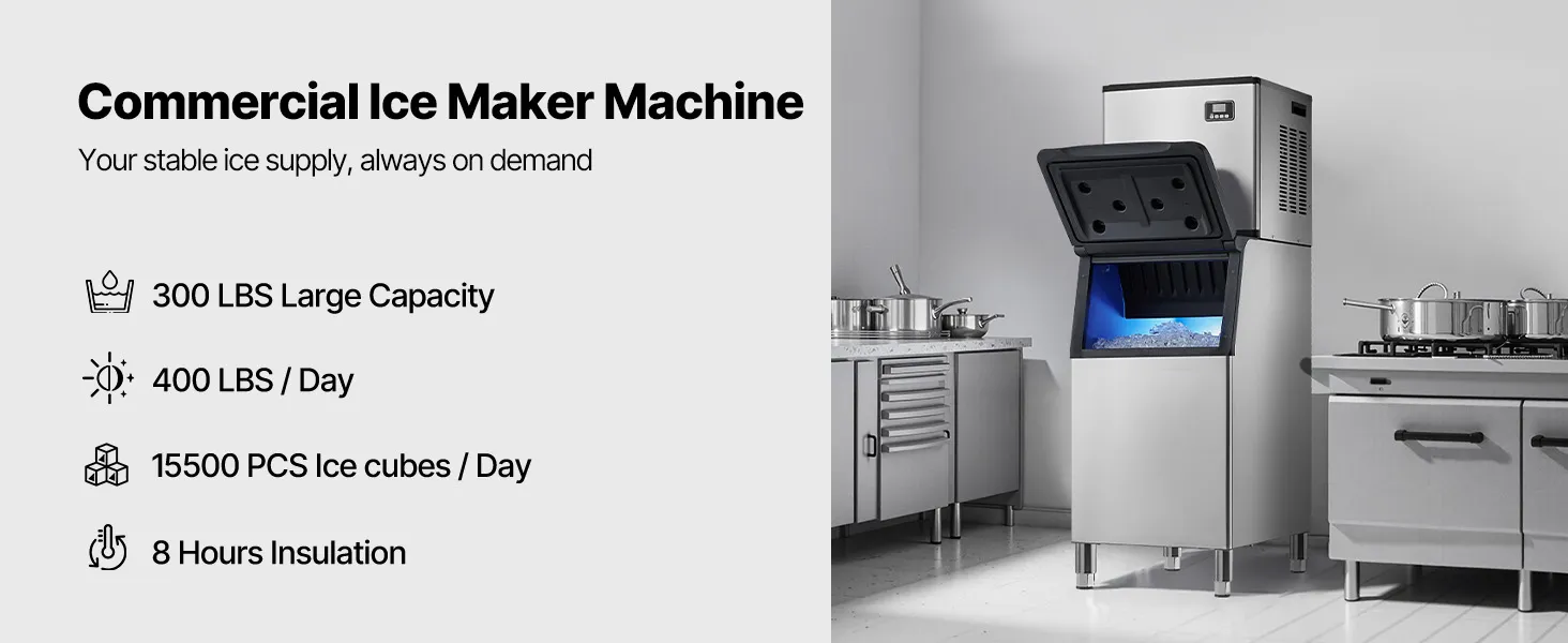Large Ice Production: This commercial ice maker can produce 400 lbs of ice per 24 hours, with a 300 lbs large capacity and excellent insulation, ensuring a continuous supply of ice