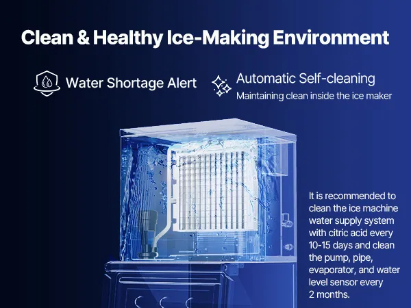 Easy to Clean: The commercial ice maker machine features a one-touch self-cleaning function, providing you with a clean and healthy ice-making environment and ensuring that the ice cubes are clean