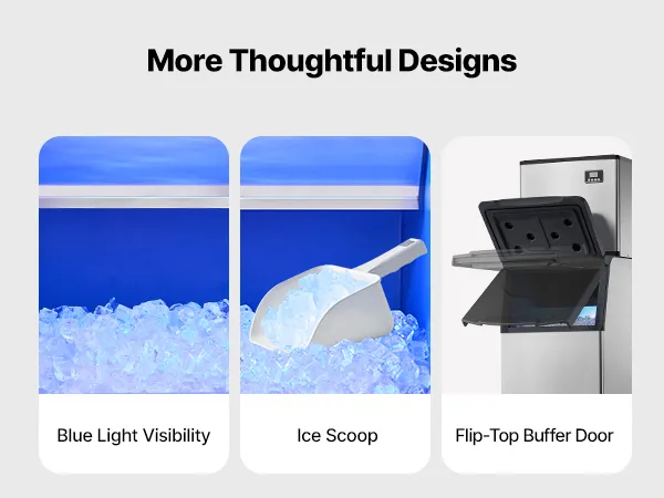 Intelligent Control Panel: The intelligent touchscreen allows you to adjust the ice thickness and activate the self-cleaning function with ease. The indicator lights on the panel provide real-time status updates of the ice maker