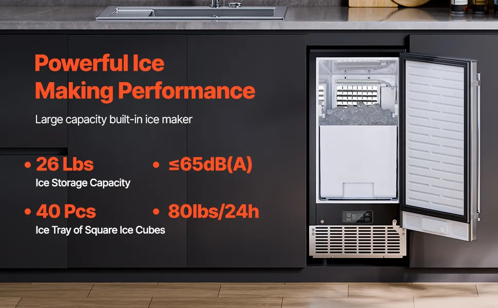 Fast Ice Making & Large Ice Storage: Our undercounter built-in ice maker can produce up to 80 lbs of ice within 24 hours and store up to 26 lbs. It features a 40-cube nickel-plated copper ice tray, making square ice cubes (0.87x0.87x0.87 inch) in as fast as 15 minutes. Ideal for home use or parties.