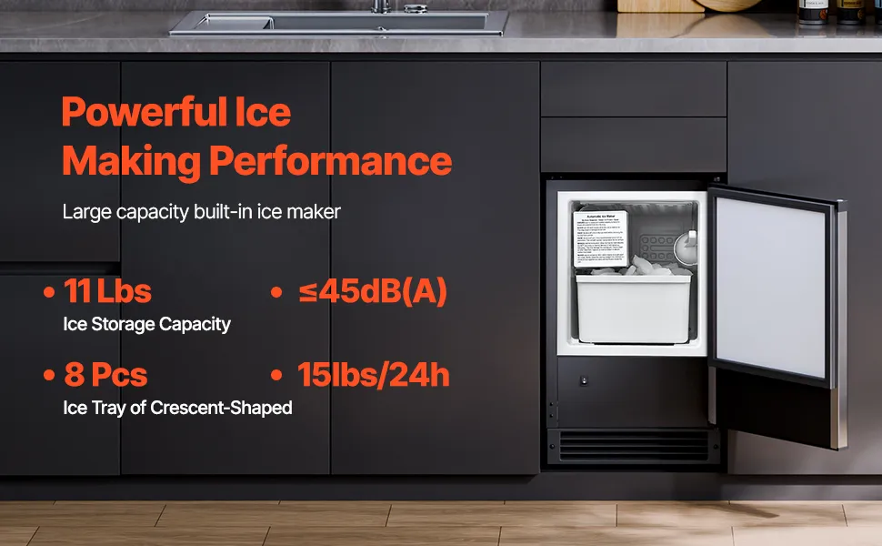 Fast Ice Making & Large Ice Storage: Our undercounter built-in ice maker can produce up to 15 lbs of ice within 24 hours and store up to 11 lbs. It features an 8-cube aluminum ice tray, making crescent-shaped ice cubes (0.87x0.87x2.36 inch) in as fast as 20 minutes. Ideal for home use or parties.