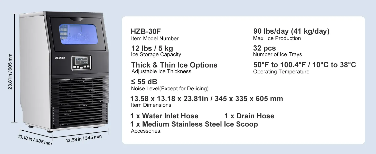The Ice Machine is very nice and works as advertised. The only complaint i have is with the shipping Co. The delivery driver arrived at my location at 4:30pm and could not locate the item on his truck. The driver spoke very little english and could read even less. He apologized for it not being on his truck and left. Come to find out. They delivered my ice machine to a different address in a adjacent city to mine at a private residence. Delivery was supposed to be at my business. The person who's house it was left at called me and informed that it was outside of his house and he was afraid it would get damaged, as we were expecting a bad Ice storm tha night. I had to go on a 2hr round trip to retrieve it on a late Friday Evening. I would suggest that Vevor not use this shipping company again.