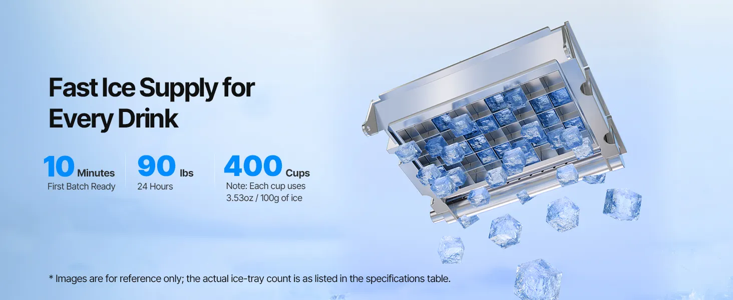 Efficient Ice Making: The commercial ice maker produces 32 cubes per cycle and up to 90 lbs of ice daily, with 12 lbs of ice storage. Ideal for home, bar, or light commercial use. ETL and ENERGY STAR certified for secure and efficient performance
