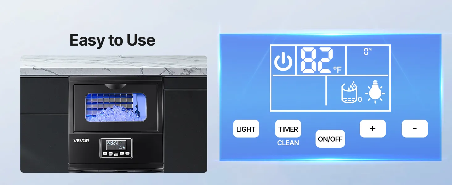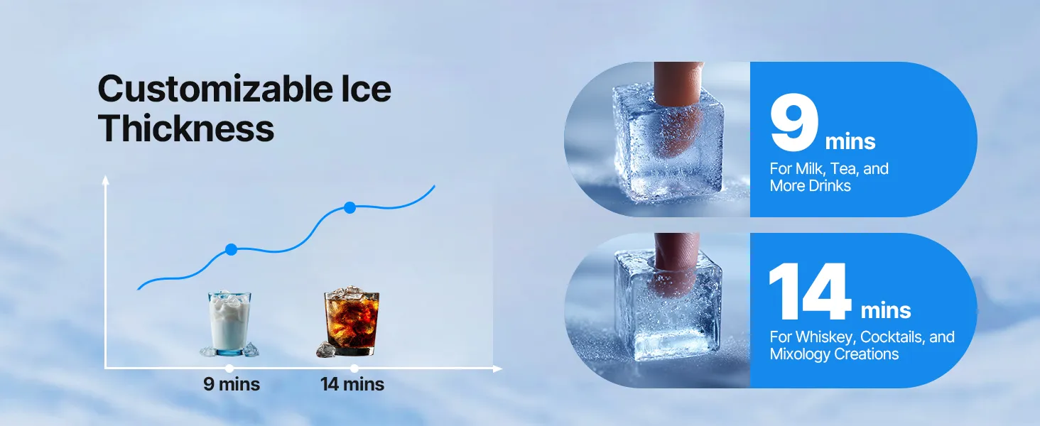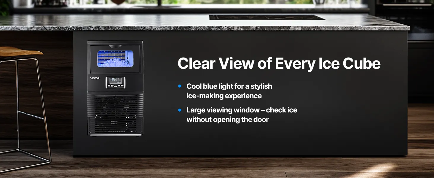 Easy Operation: This ice maker machine features intuitive LED controls, just select thick or thin cubes with one touch. The large viewing window and blue interior lighting let you monitor the ice-making process without opening the lid