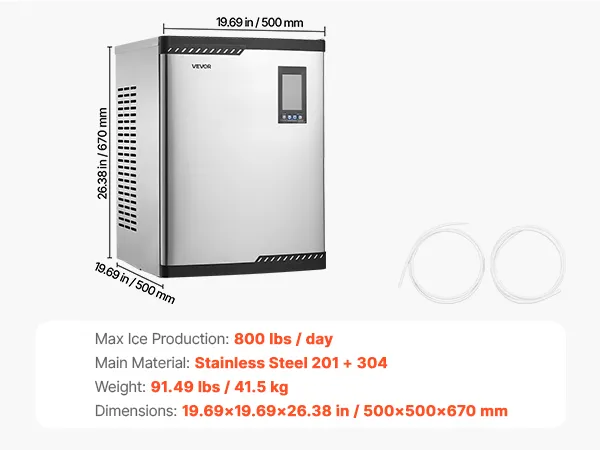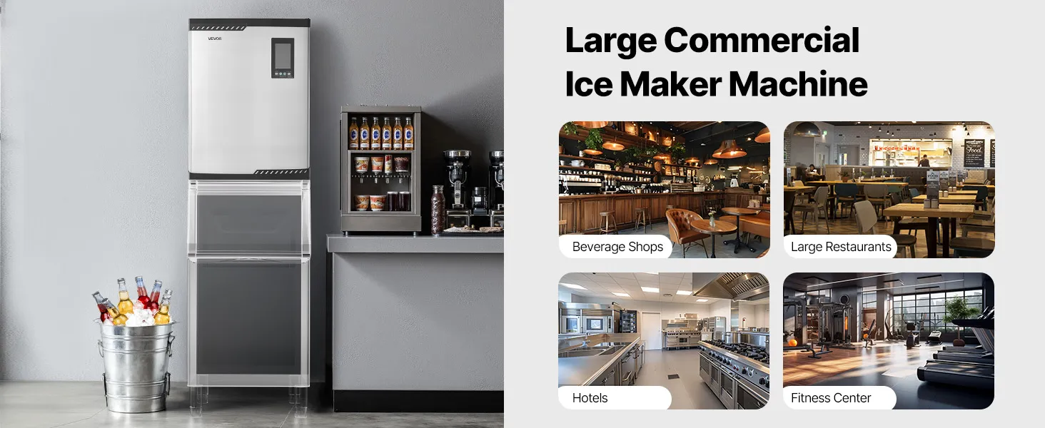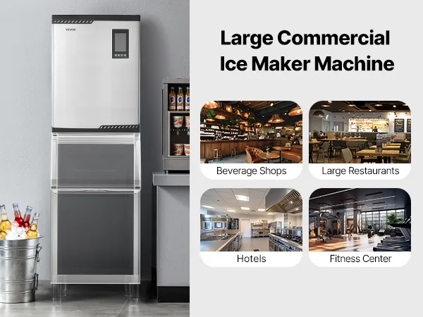 The ice cube machine provides a large ice output, making it ideal for commercial kitchens, restaurants, bars, hotels, and beverage shops.
