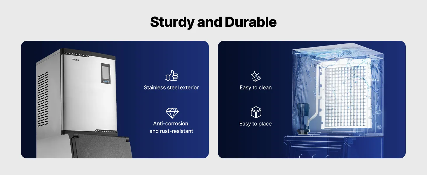 The commercial ice maker machine features a refined stainless steel shell, which is rust and corrosion-resistant, easy to clean, and highly durable.
