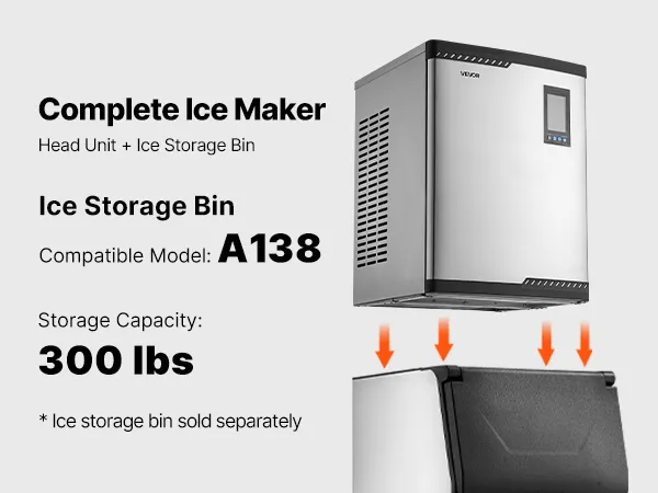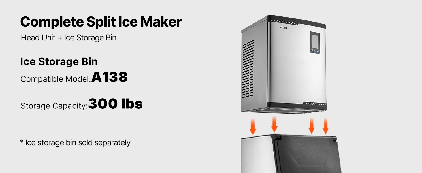 The head unit and ice bin combine to form a complete commercial ice maker. We provide a 300 lbs / 136 kg ice bin configuration, which is sold separately.