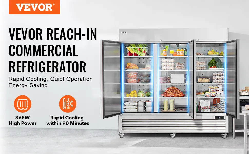 The VEVOR stainless steel refrigerator features a sleek and stylish design with a durable, corrosion-resistant stainless steel exterior. This design is easy to clean and maintain, making it ideal for busy environments. The stainless steel not only adds elegance to any setting but also ensures long-lasting use without compromising on aesthetics. Its sleek style makes it a prestigious addition to your kitchen or commercial space, while the durable exterior ensures the refrigerator stays in good condition over time.
