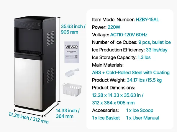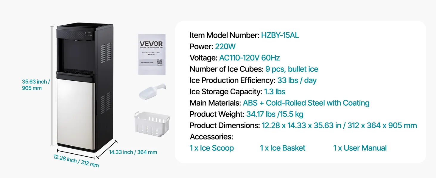 Our water dispenser with an ice maker produces 9 bullet ice cubes in about 7 minutes and continues producing up to 33 lbs per day. The built-in ice basket can store up to 1.3 lbs of ice ready for quick use. It comes with an ice scoop for easy access through the top cover.