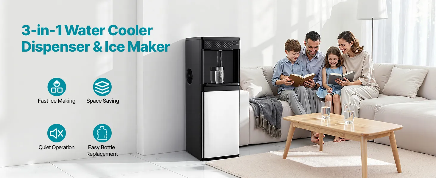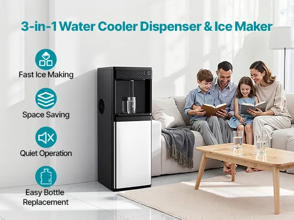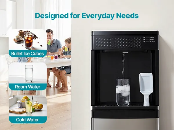 This water cooler dispenser with a built-in ice maker delivers room-temperature water, cold water, and fresh bullet ice in one unit, providing versatile drinking options for everyday use.