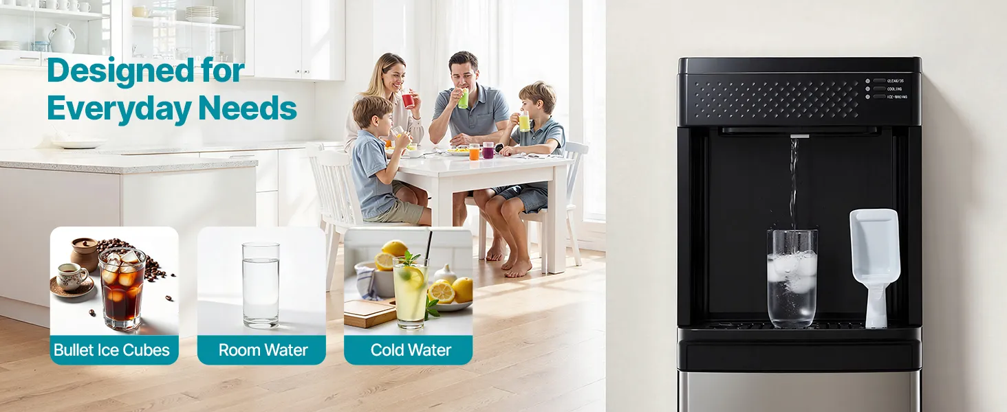 Enjoy room-temperature water for daily hydration, cold water for refreshing drinks, and fresh bullet ice for iced coffee and chilled beverages.