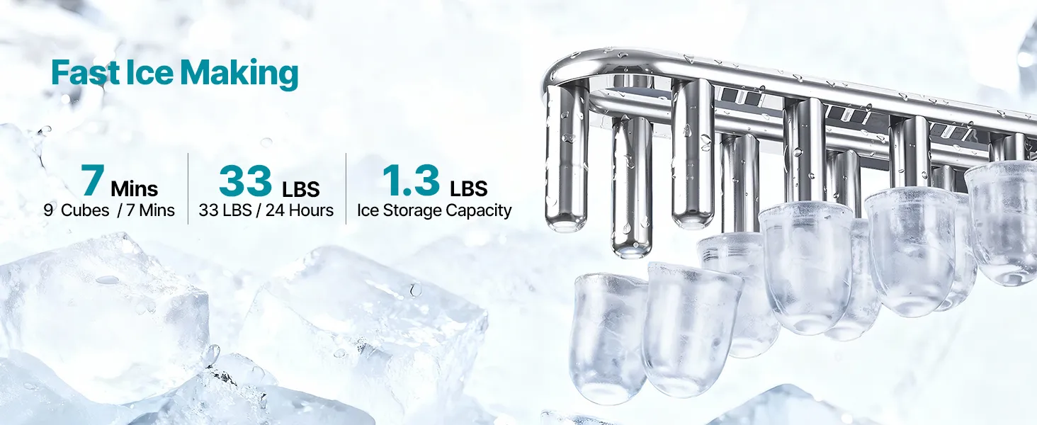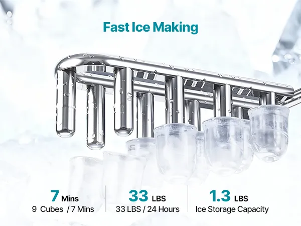 Fast Ice Production in 7 Minutes: Our ice maker water dispenser produces 9 bullet ice cubes per cycle and up to 33 lbs per day. The 1.3 lb ice storage keeps your water cooler with an ice maker ready whenever you need ice