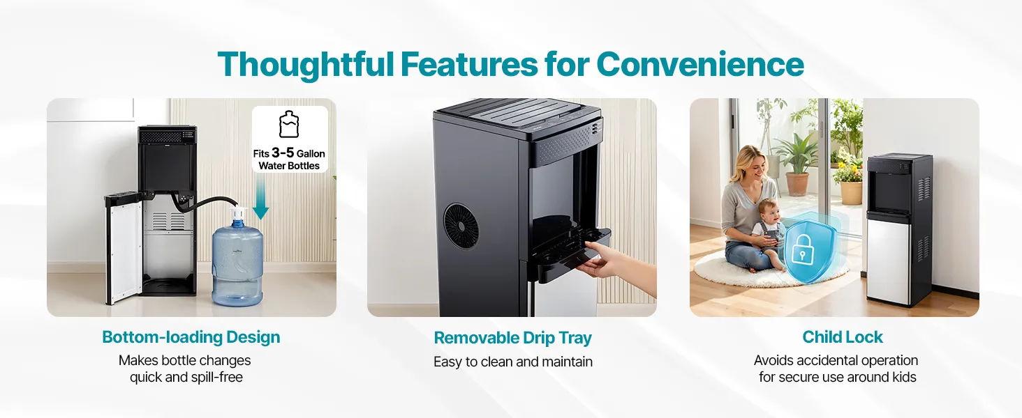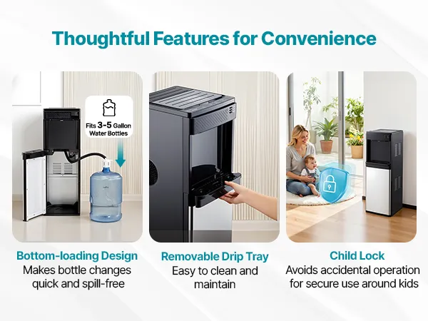 The bottom-loading design makes bottle changes fast and spill-free. A removable drip tray is easy to clean and maintain. Child lock and overheat protection provide reliable operation.