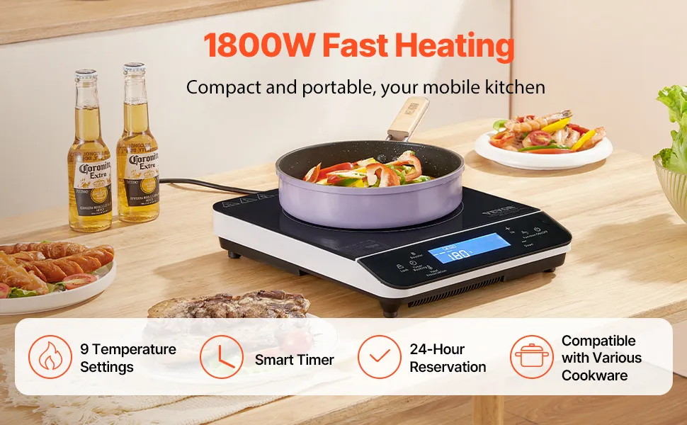 Efficient Heating: With 1800W high-power output and a large coil, this portable induction cooktop ensures fast and even heating. It's ideal for various cooking styles including boil, steam, searing, and stir-fry.
