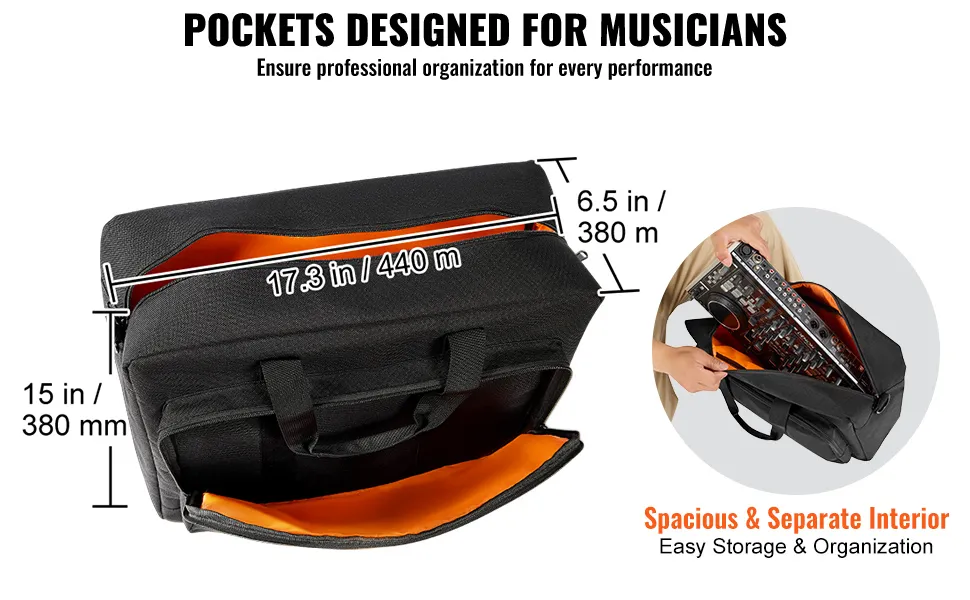 The VEVOR DJ mixer gig bag provides ample storage space. It includes multiple compartments and zipper pockets to keep your gear organized. The interior dimensions are 17.3 x 15 x 6.5 inches, giving you plenty of room for your equipment. The bag also has two zipper pockets on the front and two smaller pockets inside the lid. This design ensures that you have enough space to store all your essentials, from cables to adapters, keeping everything within reach.