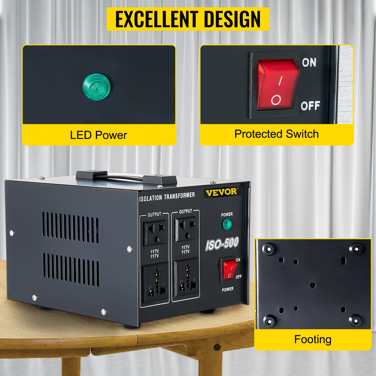 High-Security: A Current protector is built in this 120V isolation transformer to avoid overloading while the cooling rails on both sides prevent overheating. In addition, the LED power and protected switch ensure security and help you control the 500W isolating machine quickly.