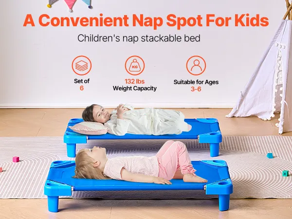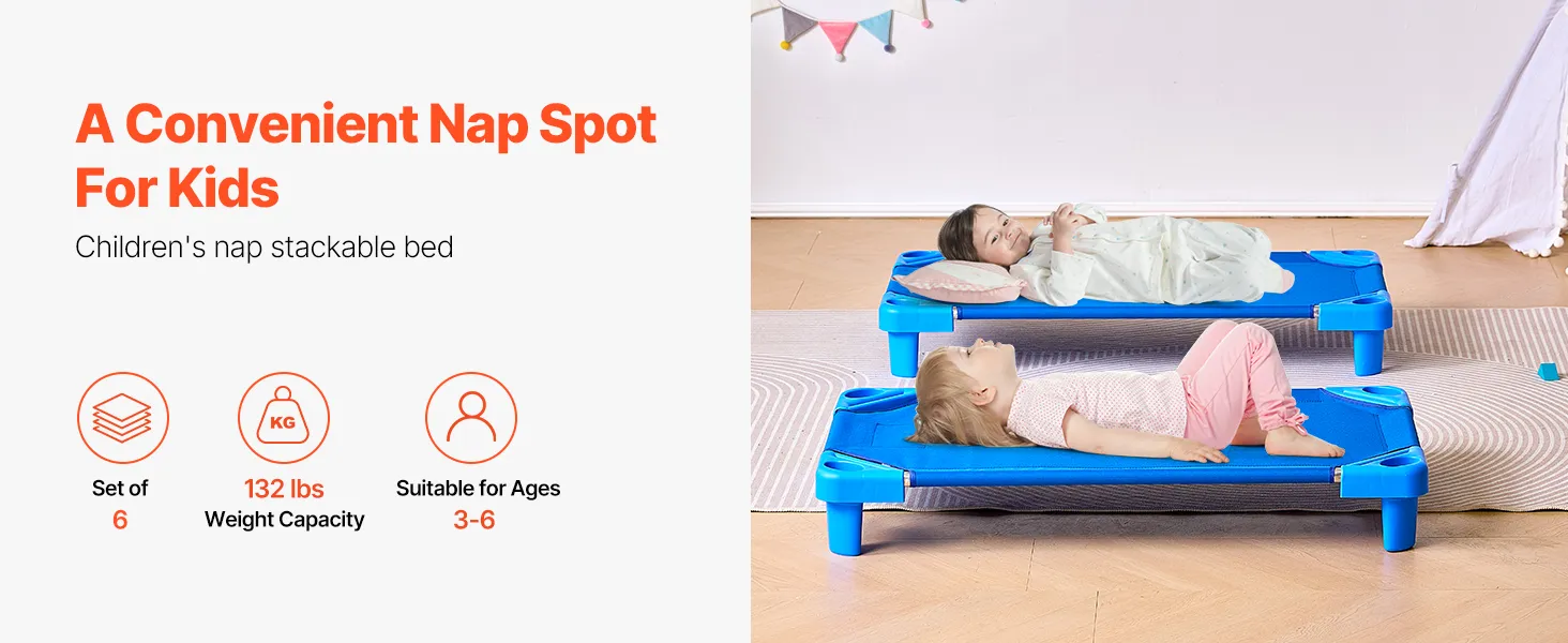 Cuna apilable VEVOR (paquete de 6), cuna portátil para la siesta, tamaño estándar: 101 cm de largo x 58 cm de ancho. Ideal para guarderías infantiles, aulas preescolares, para dormir, descansar y tomar la siesta, color azul.