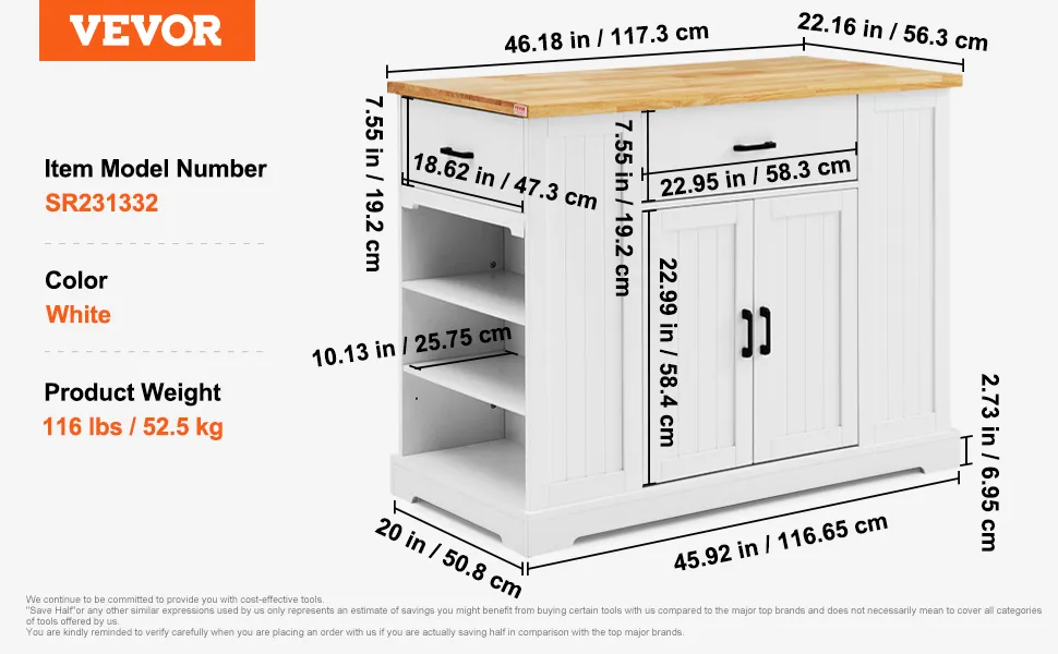 VEVOR Kitchen Island Cart, 46" Wood Top Breakfast Bar with Storage Cabinet, Farmhouse Kitchen Table with Adjustable Shelf, Drawer, for Dining Kitchen Living Room, White VEVOR Kitchen Island Cart, 46" Wood Top Breakfast Bar with Storage Cabinet, Farmhouse Kitchen Table with Adjustable Shelf, Drawer, for Dining Kitchen Living Room, White