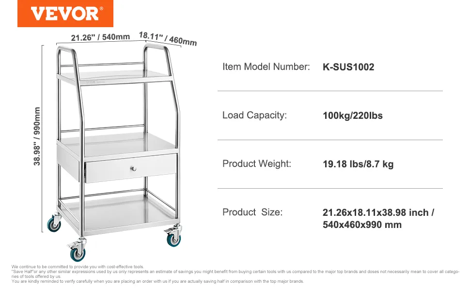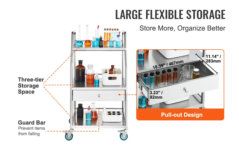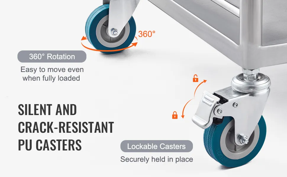 Not only does the VEVOR lab serving cart function well, but it also looks great. Its sleek stainless steel design adds a touch of elegance to any setting. The cart's modern look fits well with various decor styles. Although its simple design appeals to quality and style, it is incredibly useful for professional and personal spaces. You get an aesthetically pleasing and highly functional cart that blends form and function.