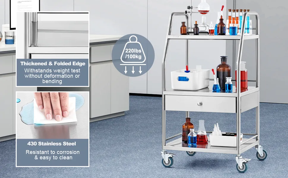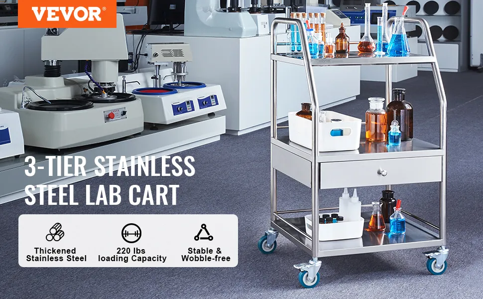 It is very versatile. You can use it in homes, offices, and medical facilities. This means you can carry food, medical supplies, or tools easily. The cart has a three-tier design and large wheels that make it easy to move around. Our cart holds up to 220 lbs. So, this machine is perfect for anyone who needs a dependable and versatile cart. If you need a cart that can easily handle various tasks, then choose the VEVOR lab serving cart.