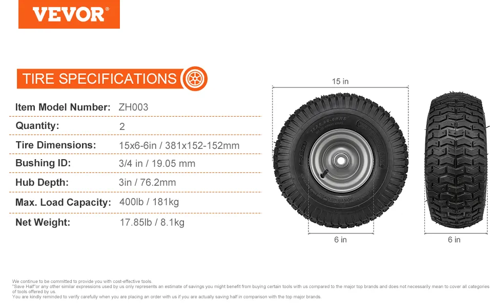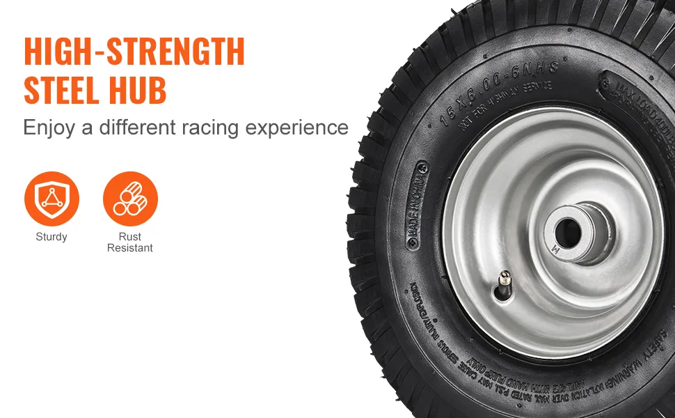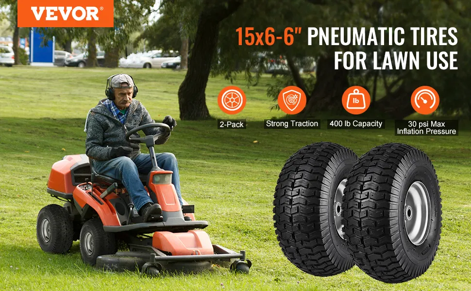 Our 2-pack 15x6-6" lawn mover tires with a load capacity of up to 400 lbs. These wheels are crafted from explosion-proof and leak-proof rubber and steel material, built to last.