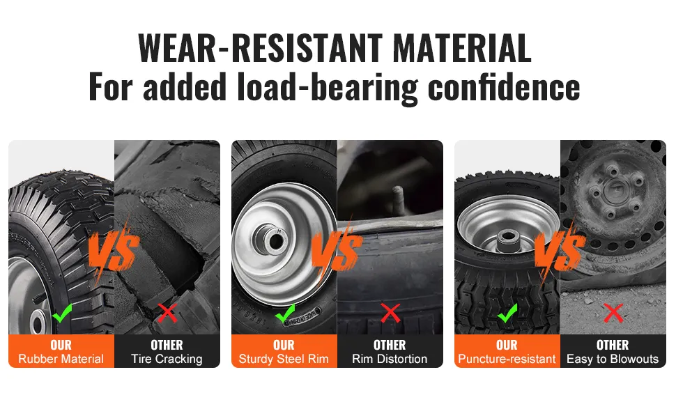 The VEVOR lawn mower tires are built to last. Each tire has a load capacity of 400 lbs. This ensures that they can handle heavy loads without any issues. The strong construction makes them durable and long-lasting. They're made from strong rubber that resists wear and tear. They can deal with tough conditions without losing their shape. Solid construction makes sure these tires can manage various outdoor tasks. Their high load capability makes it suitable for heavy-duty mowers. You can trust these wheels to provide reliable performance for a long time. The robust construction ensures that all your mowing needs will be met.