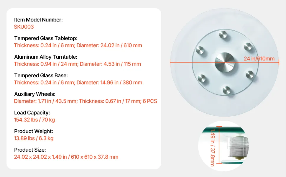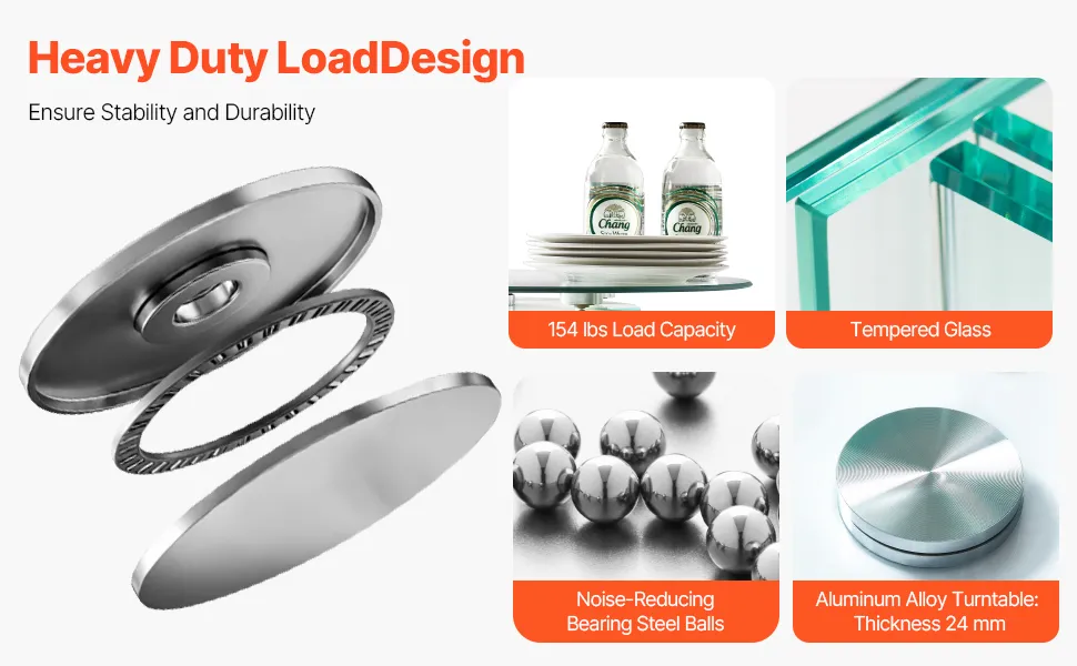 Heavy-Duty Load Capacity: Our round glass Lazy Susan has a load capacity of 154.32 lbs, capable of securely supporting any amount of tableware or food, avoiding deformation of the tabletop and ensuring stable use over time, making it suitable for gatherings of all sizes.