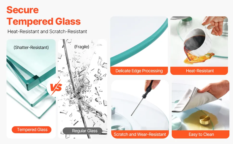 Heat-Resistant Material: Constructed from 6 mm thick tempered glass, this tempered glass turntable is heat-resistant and maintains stability even with hot dishes or soups. Whether serving hot pot or stir-fried dishes, it remains reliable and secure.