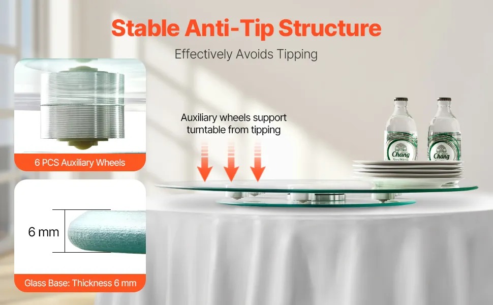 Stable Anti-Tip Design: With six auxiliary wheels evenly distributed, this tabletop rotating tray enhances stability, avoiding accidental tipping even during high-speed rotation. It ensures secure dining for everyone, making it ideal for daily use by the whole family.